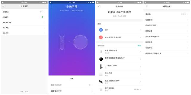 在Yeelight皓石智能LED吸顶灯设备设置里,可以设置掩饰关灯、小夜灯模式开关、遥控器开关、默认状态和小米手环绑定后,实现小米手环联动开关。智能联动也是米家APP的优势,可以同其他接入米家APP产品实现联动,比如,打开鹿客智能锁后,可以实现开灯,或者小米小爱设置闹钟后,可以实现自动开关或者关灯等等。