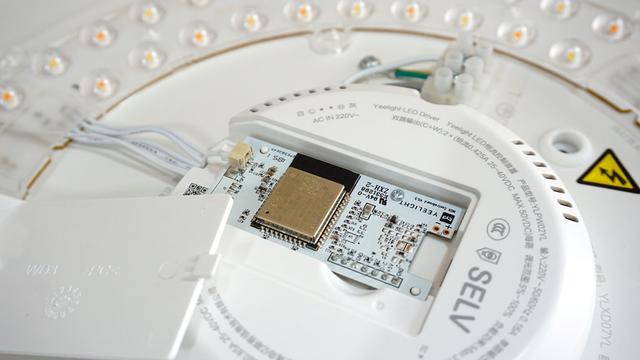 在吸顶盘的中间是智能灯的"大脑"所在,也就是芯片的位置,该芯片集成了色温调节、灯光控制以及智能联动等功能,除了可通过遥控器对吸顶灯实现控制外,也可以通过米家APP、小爱同学、天猫精灵、Yeelight语音助手等等智能语音音箱来进行控制,用起来确实方便不少。而且在芯片的焊接和做工上,焊接整齐,专业,无漏焊,可见做工的严谨了。